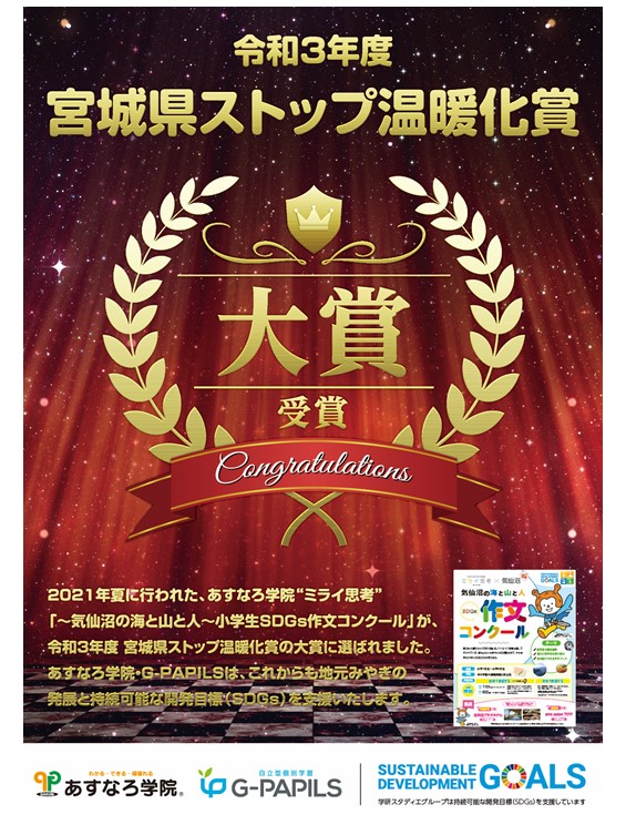 (株)学研スタディエ あすなろ学院が、地元宮城の子ども達応援企画~ミライ思考~ の第1弾として今夏実施した、「気仙沼の海と山と人 小学生SDGs作文コンクール」と、付随する諸所の取り組みに関して、令和3年度宮城県ストップ温暖化賞の大賞を受賞しました。